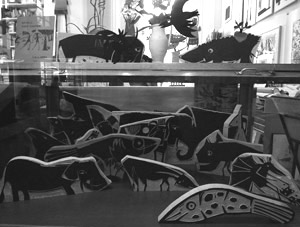 ブラジル出身、ハンブルク在住の木版画家、チタのアトリエのショウウインドウ。版木の余りからできあがった、愛らしい動物のオブジェ。