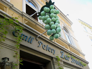「ツア・トラウベ」は、「ぶどうの房のほうへ」という意味。カール・テオドア通りに入ると、店の番地を覚えていなくても、薄緑色の大きなぶどうの房の形をした照明がすぐに見つかるから、それに向かって歩くだけ。あのぶどうの房が目にとまると、ぶどうの精に誘惑されるような、非現実的な感覚に襲われ、気がついたらレストランの扉を開けている。