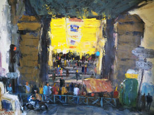 伯父の油絵は、印象派と繋がっています。カンバスに載せられた絵の具は光のかけらであり、絵筆は決して輪郭を追いかけたりしません。カンバスに置かれた絵の具の跡は、近くで見ると現代美術のペインティングに見えたりもするのですが、ある一定の距離をとって見ると、例えばそれが人であることがわかり、人だとわかると、今度はその人の性別やだいたいの年齢から、身にまとっているものの素材や顔の表情までが見えてきます。なんて高度で素晴らしい技術なのでしょう。このページにはメトロの駅と広告のある壁を描いた作品を集めてみました。